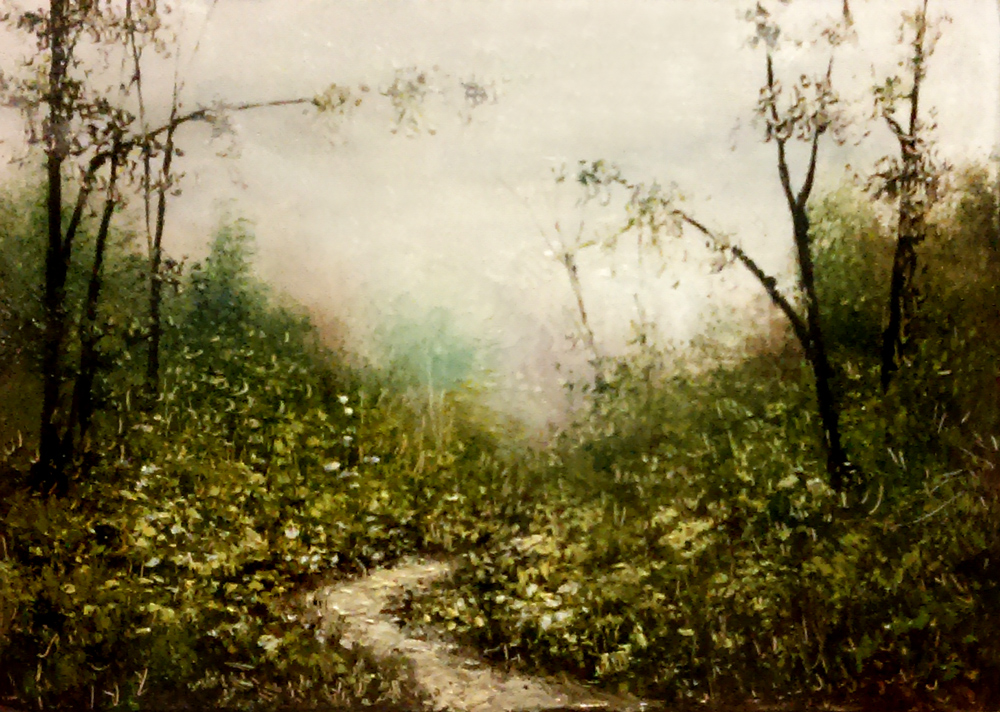 This is a figurative painting of a young woman in a nightgown, seemingly in here own world. and in deep thought. It is painted on a 5x7 on.a gessoboard and varnished.